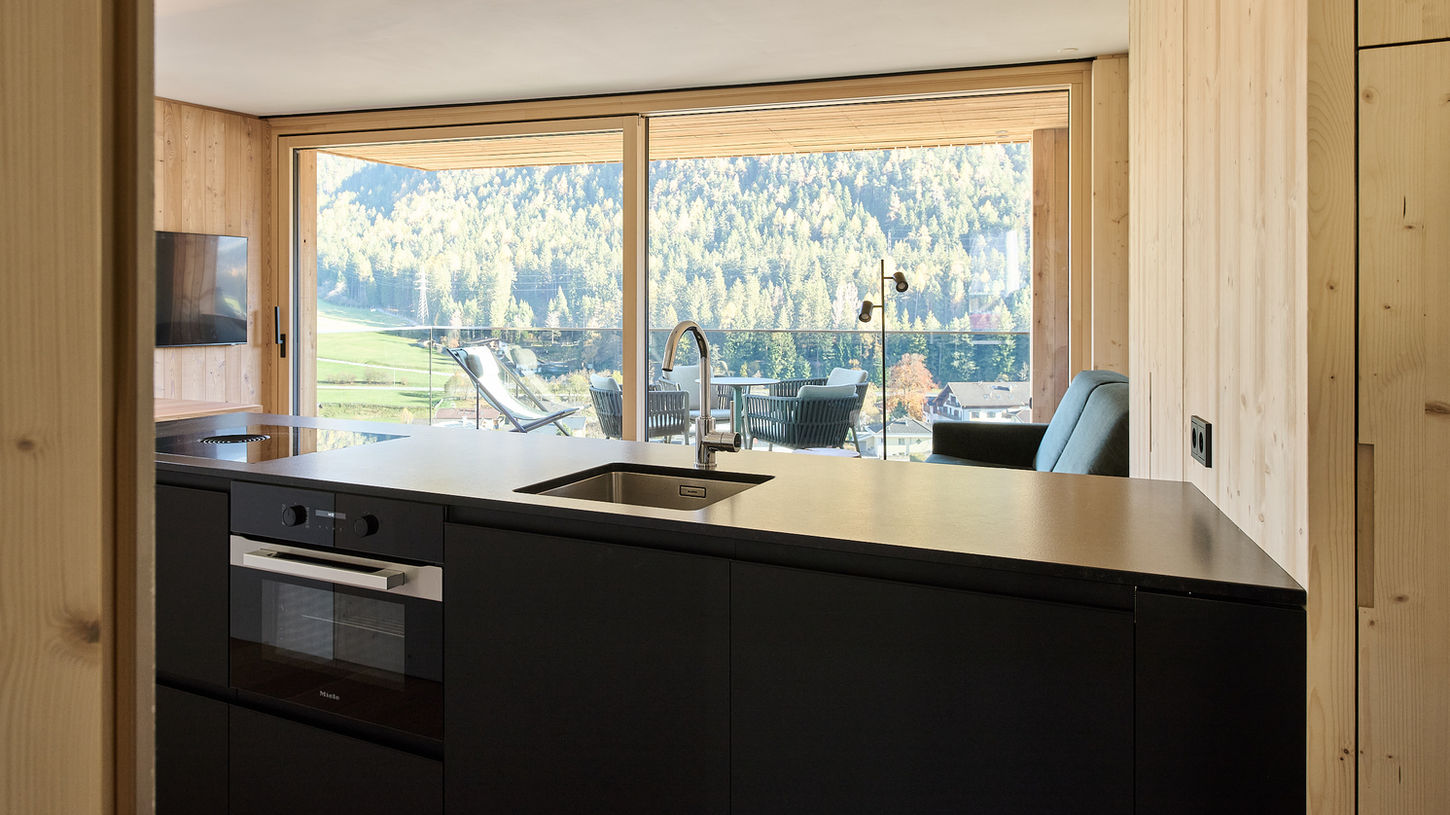 Küche mit Mikrowelle, Bora Dunstabzug, Induktionsherd, Kühlschrank, Geschirrspüler, Backofen, Filter Kaffeemaschine